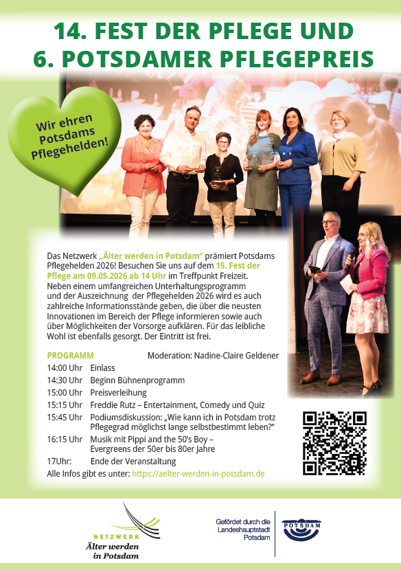 Angehörige pflegebedürftiger Menschen, ehrenamtlich Pflegende und professionell Beschäftigte in der Pflege sind die tragenden Säulen der pflegerischen Versorgung. Sie leisten täglich eine wertvolle Arbeit. Das Netzwerk „Älter werden in Potsdam“ bedankt sich in Zusammenarbeit mit der Landeshauptstadt Potsdam mit dem 14. Fest der Pflege und der 6. Verleihung des Potsdamer Pflegepreises bei all den Menschen, die sich dieser wertvollen und anspruchsvollen Aufgabe stellen. Gemeinsam mit verschiedenen Institutionen und Einrichtungen findet eine festliche Veranstaltung mit der Auszeichnung des Pflegehelden 2026 und einem Unterhaltungsprogramm statt. Informationsstände geben einen Überblick über neueste Innovationen im Bereich de Pflege und Möglichkeiten der Vorsorge.