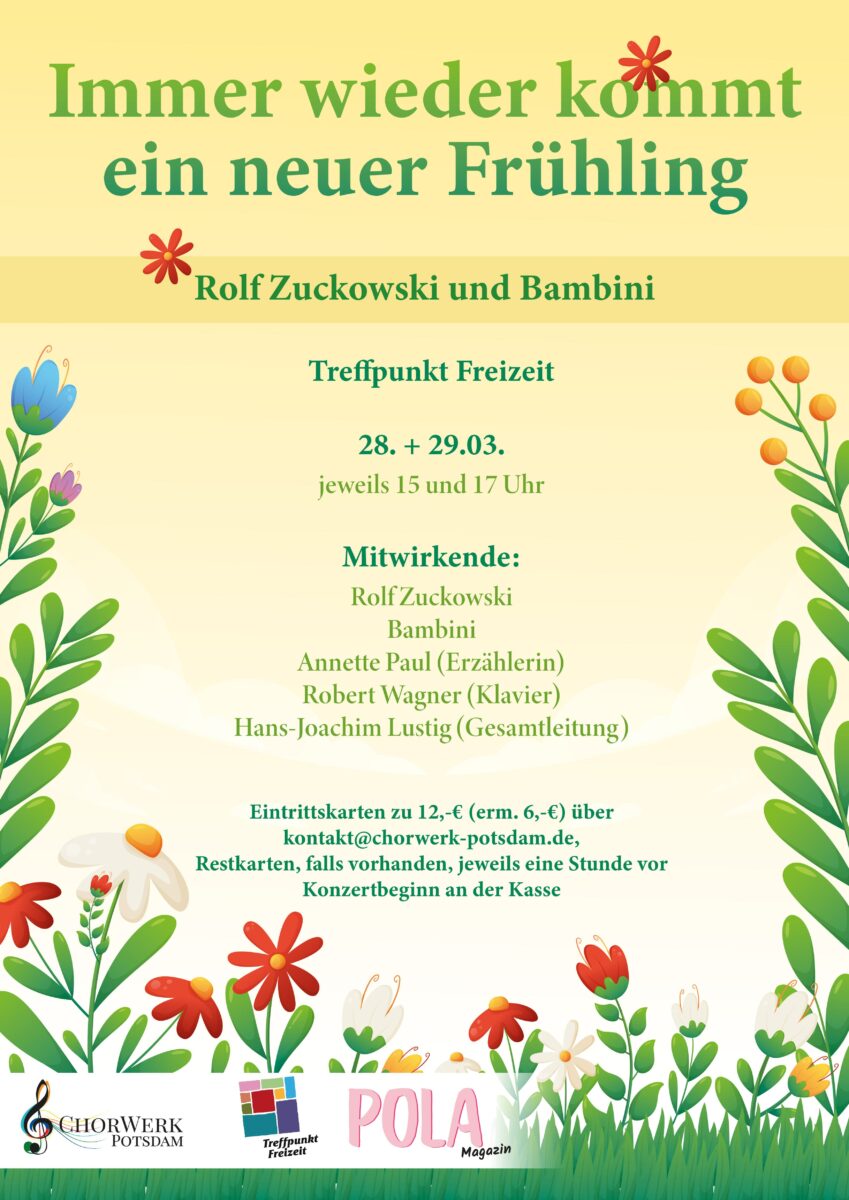 Rolf Zuckowski und der Bambini-Chor des Chorwerk Potsdam unter der Leitung von Hans-Joachim Lustig laden euch zu einer musikalischen Reise in den Frühling ein. Das Konzert wird erzählerisch von Annette Paul und instrumental von Robert Wagner begleitet.